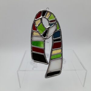 I have taken a picture of the example piece, and the piece you receive will be made just for you, so it is a one off. Although your piece will be the same size and design as the example piece, colours and textures may vary due to glass available at the time. The piece has a hanging hoop. The glass looks great hung with light shining through it, either natural or candle light. If you have any questions please ask.