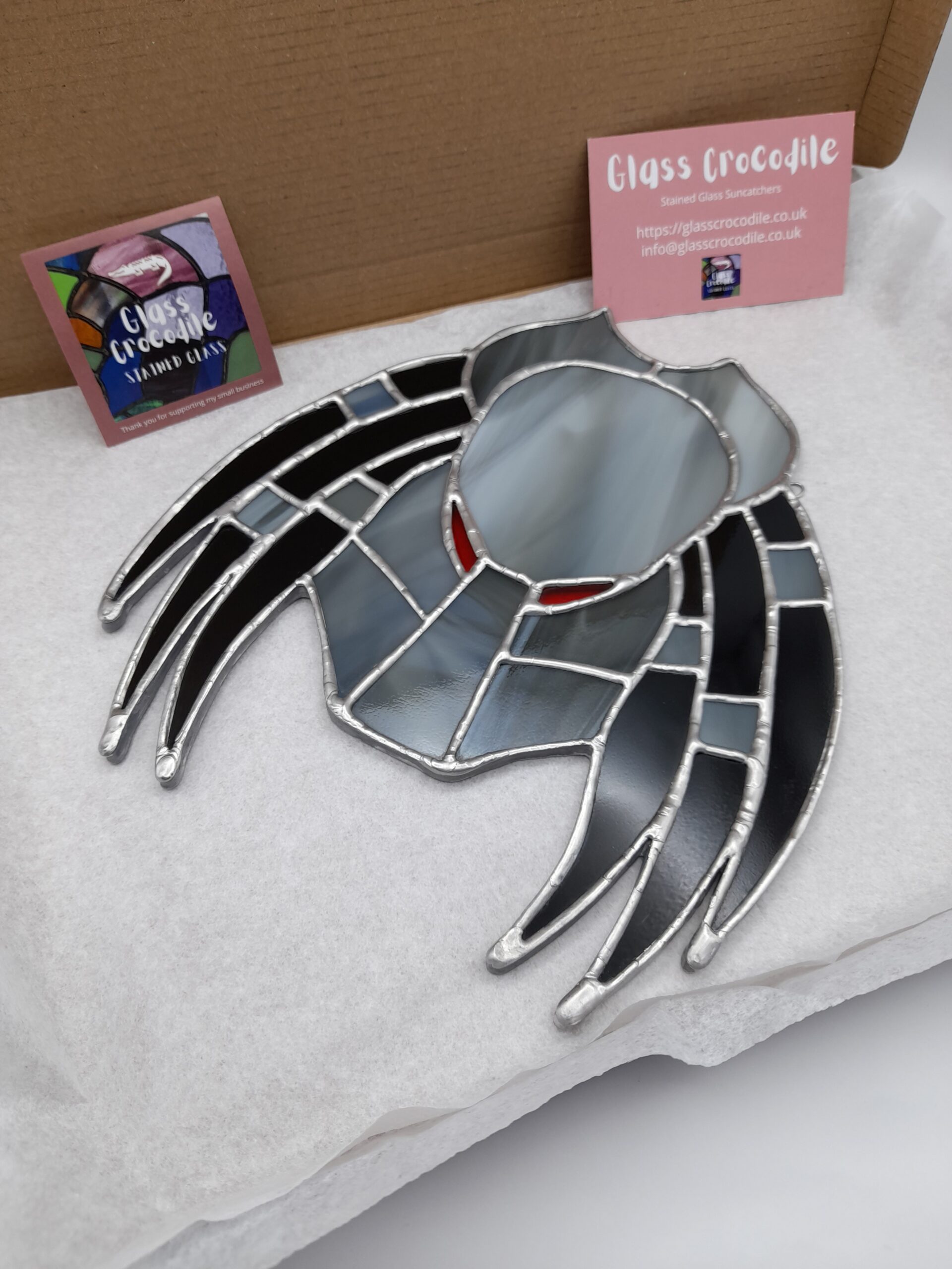 This piece is made using Opalescent shades of wispy grey and black glass. It also includes translucent red glass eyes. The stand is for display purposes as this piece is designed to hang. All my work is bubble wrapped and boxed for safe postage. Please note that postage is as a small parcel due to size of box.