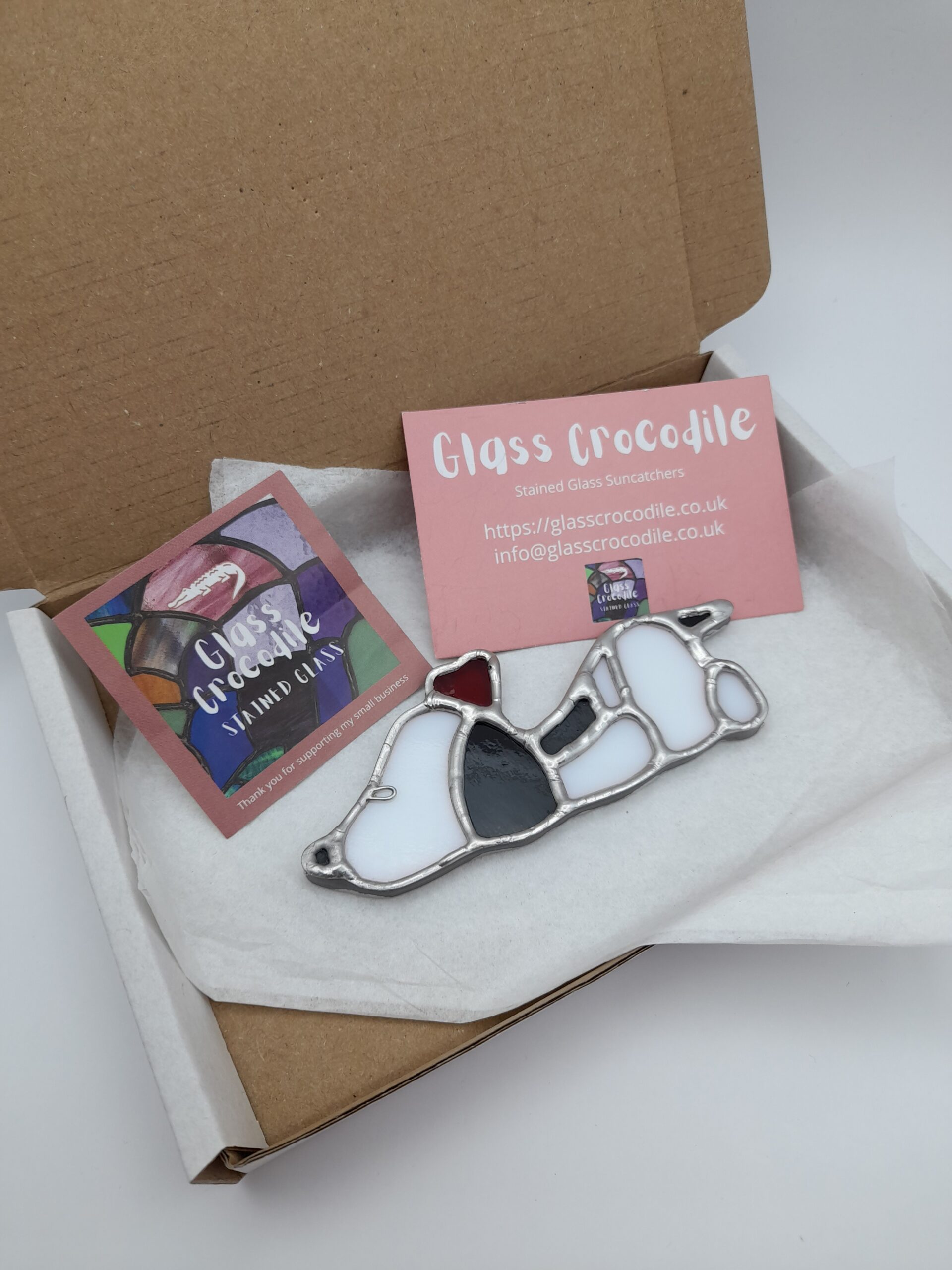 These pieces are created using opaque and Translucent glass in various shades of Black, White and Red. All my work is bubble wrapped and boxed for safe postage. Please note that postage is as a small parcel due to size of box.