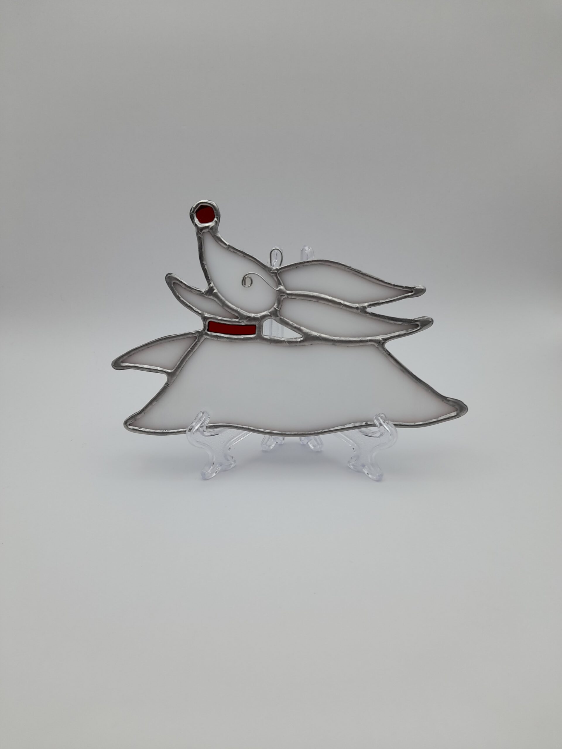 Stained Glass Suncatcher Zero from Nightmare Before Christmas Inspired Design. This is my own design which I make myself using the tiffany method of stained glass making, using new and reclaimed glass. The glass is cut, ground, encased in copper foil then soldered together. I finish the pieces by surrounding the edge in lead which gives the piece an added dimension and also stability. All the glass I use is professional stained glass with the colour and textures already within the glass, meaning the glass will not fade or discolour over time.